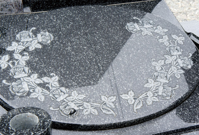 墓石の中央に、「光」や「花」などの文字を彫刻したデザインです。彫刻文字はご要望に応じて変更することが出来ます。